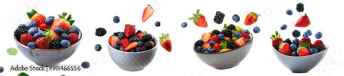 Mixed berry bowls featuring strawberries, blueberries, raspberries, and blackberries in ceramic bowls against a white background.