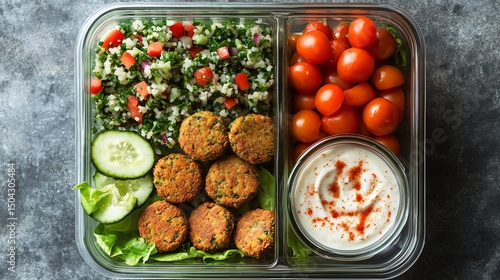 food, salad, healthy, lunch, meal, vegetable, tomatoes, greener, dressing, nourishment, vegetarian, vegan, balanced, diet, fresh, colourful, delicious, bowl, container, glasses, presentation, arrangement, ingredient, cookery, culinary, epicure, organic, natural, wholesome, vibrant, tasty, appetising, texture, closeup, topview, studio shot, dark background, rustic, lifestyle, wellness, balanced diet, food photography