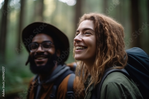 person, couple, nature, hiking, man, forest, walking, tree, hat, love, summer, adult, hiker, african american, caucasian, vacation, active, friends, happiness, boyfriend, young, walk, backpack, autumn, outside, smiling, female, together, lifestyle, african, hike, 2, male, exploration, holiday, woman, ai