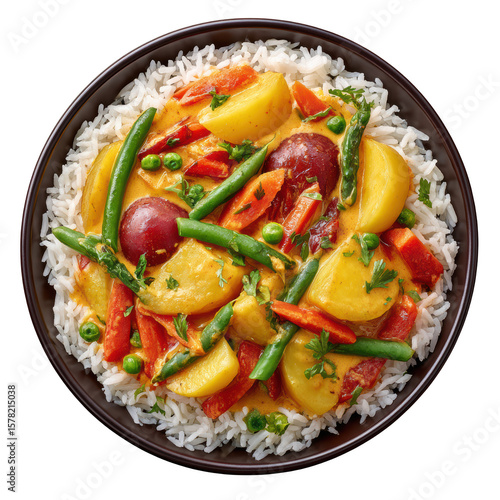 Mixed Vegetable Curry Simmered in Coconut Sauce Served Over Rice for a Delicious Meal Experience