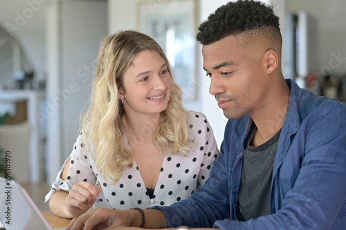 couple, man, woman, computer, laptop, ethnicity, connected, cyberspace, camera, blonde woman, african american, smiling, happy, happiness, 30s, 30s, home, inside, lifestyle, togetherness, cheerful, adult