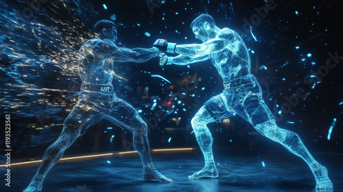 light, people, art, vector, hand, man, technology, fitness, hologram, digital, combat, strong, cage, strength, futuristic, fighter, blood, battle, male, flux, training, datum, mixed, boxing, glove, sport, virtual, octagon, power, punch, muscular, projection, kickboxing, laser, scientific, competition, energy, blue, athlete, neon, particle, ring, flickering, fight, science, martial, arena, tech, adult