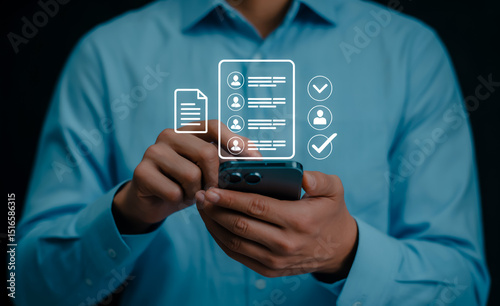 mobile, app, task, management, checklist, user, profile, document, approval, workflow, online, smartphone, business, technology, digital, cyberspace, communication, application, device, hand, person, shirt, dark, background, interface, icon, check, list, form, touch