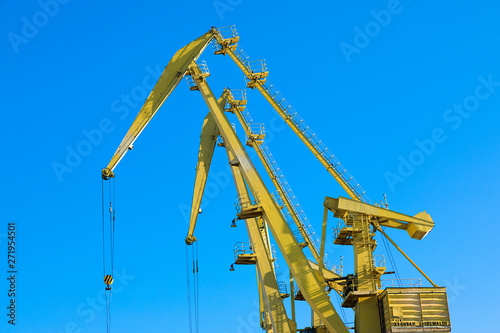 Mobile harbor cranes over blue sky. Transport and technology concept