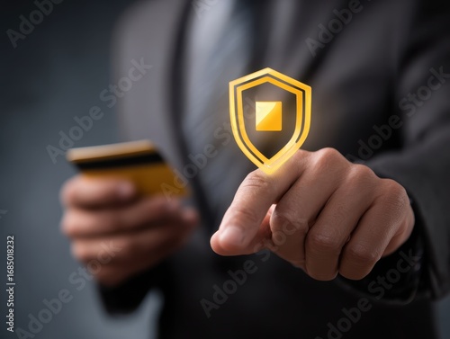 Mobile Payment Security Protection. businessman interacting with a virtual shield icon for secure payment confirmation, holding a smartphone in the background.