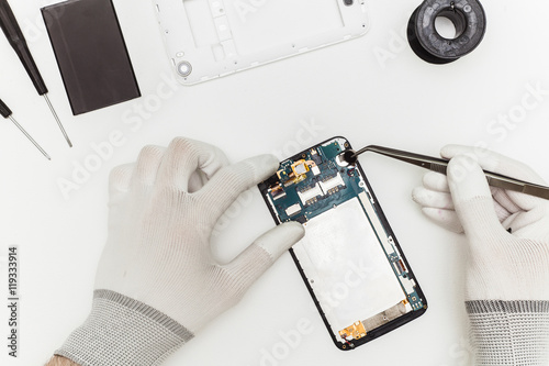 Mobile phone repairing process, flat lay, top view