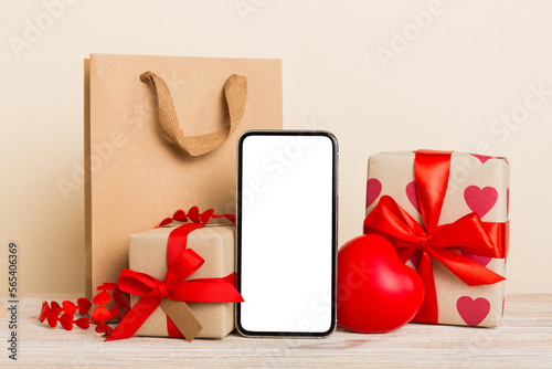 mobile phone with blank screen on colored background with hearts, calendar and gift box, valentine day concept perspertive view flat lay
