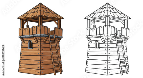 Mobile Siege Tower Coloring Page with Colored and Outline Renderings Medieval Warfare