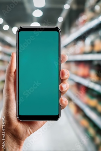 Mobile-First Retail Experience Minimalist Smartphone Mockup in Modern Grocery Aisle - Digital Shopping Innovation and Consumer Tech Engagement