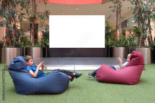 Mock up. Blank advertising screen in modern shopping mall. Children with mobile phone near big blank digital screen