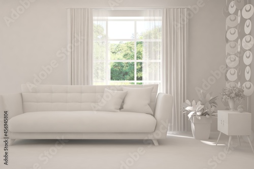 Mock up of stylish room in white color with sofa and green landscape in window. Scandinavian interior design. 3D illustration