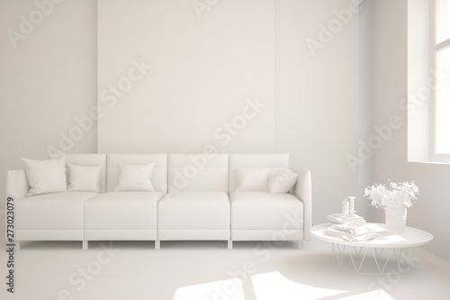 Mock up of stylish room in white color with sofa. Scandinavian interior design. 3D illustration
