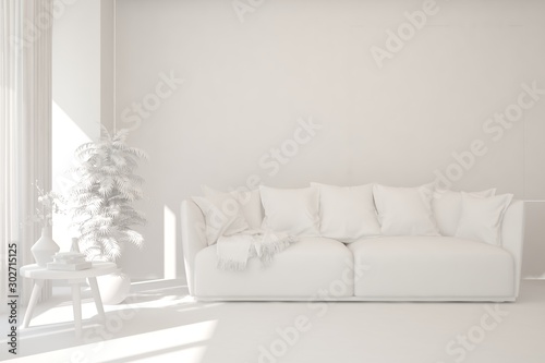 Mock up of stylish room in white color with sofa. Scandinavian interior design. 3D illustration