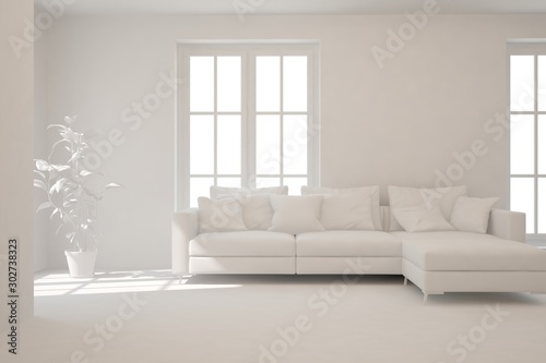 Mock up of stylish room in white color with sofa. Scandinavian interior design. 3D illustration