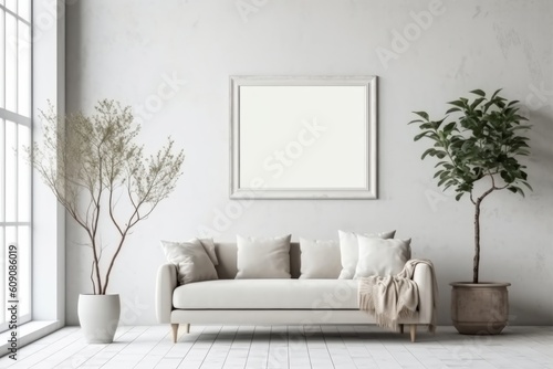 Mock-up frame in modern home and white interior with sofa, fur, table and branch. Generative AI