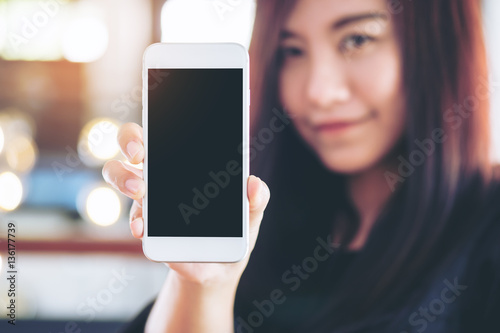 Mockup image of a beautiful woman holding and showing white mobile phone with blank black screen and smiley face in vintage cafe