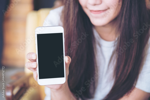 Mockup image of a beautiful woman holding and showing white mobile phone with blank black screen with smiley face in vintage wooden cafe
