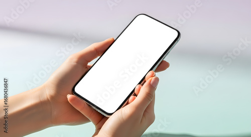 Mockup of a Smartphone Held by Human Hands for Advertisement Presentation with a Blank White Screen, Ready for Your New Application