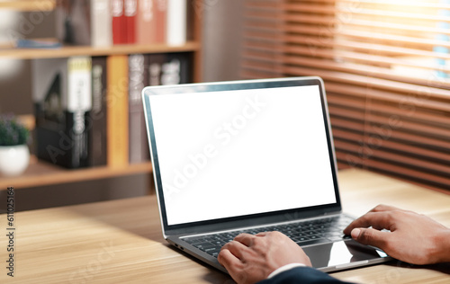 Mockup of man using and typing on laptop with blank white desktop screen.