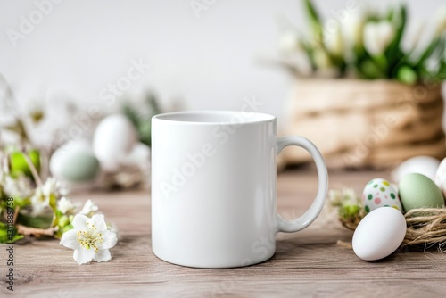 Mockup of white ceramic mug on wooden surface with easter decor