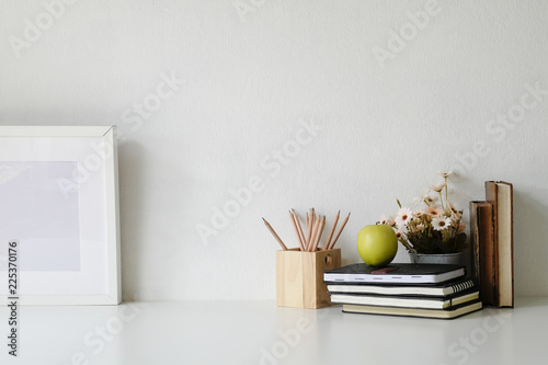 Mockup table with flower, photo frame, books, green apple and jar of pencil on white table.