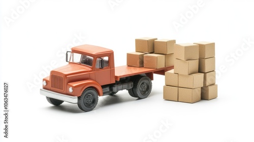 Model delivery truck beside a neat stack of small cardboard boxes, isolated on a white background, emphasizing distribution