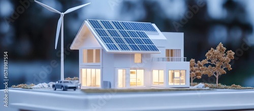 model, home, solar, panel, wind, turbine, energy, sustainable, environmentally friendly, architecture, design, building, light, modern, white, miniature, representation, eco, house, green, technology, future, renewable, environment, construction, development, innovation, efficient, lighting, illustration, concept, compact, property, rendering