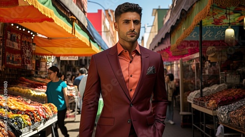 sleek, suit, model, market, vibrant, colours, fashion, urban, shopping, stall, trend, city, elegance, professional, style, business, bustle, crowd, attire, tailored, street, pose, accessory, attaching, chic, produce, fabric