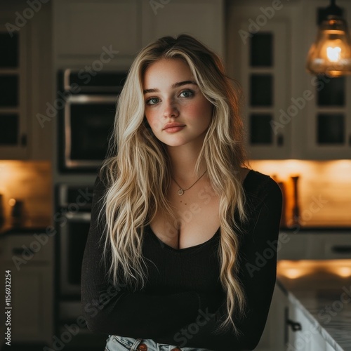 apple, attractive, beautiful, beauty, blond, bowl, breakfast, brown, cabinet, cabinet, caucasian, cheerful, hot drink, counter, cup, design, dress, eating, elegant, food, fruit, furniture, girl, hair, happy, healthy, home, house, interior, kitchen, looking, making, modern, nourishment, oatmeal, orange, portrait, pretty, room, smile, smiling, standing, style, table, up, white, woman, woman, yellow
