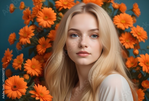 Modella bionda, vestito bianco, sfondo studio e fiori arancioni