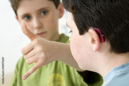 language, ear, male, 2, interior, communication, dialogue, alphabet, letter, brother, handicapped, sign language, human, person, children, european, boy, prosthesis, hearing aid, deaf