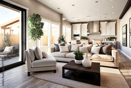 living room, modern, home interior, indoor, domestic life, apartment, house, rug, large, no people, hardwood floor, design, home decor, decoration, fireplace, empty, door, elegance, luxury, cosy, furniture, lifestyle, color image, fashionable, architecture, brightly lit, dining table, simplicity, sofa, three-dimensional, white color, comfortable, day, villa, wealth, armchair, chair, coffee table, computer graphic