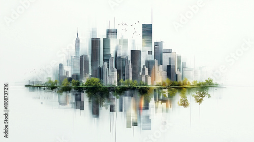 Modern abstract city skyline reflecting on water with green trees, evoking concepts of architecture and urban planning