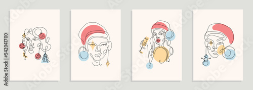Modern abstract line minimalistic women faces New Year concept for wall decoration, postcard or brochure cover design. Different woman faces. One line art. Vector illustrations design