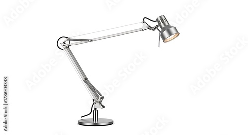 desk, lamp, table, adjustable, articulated, arm, modern, task, reading, work, office, studio, metal, silver, chrome, industrial, architect, swing, flexible, light, source, illumination, lighting, bright, illuminated, on, white, background, isolated, shot, object, design, technology, equipment, study, home, creative, vintage, style, retro, minimalist, clean, simple, functional, articulation, jointed, pivot, mechanism