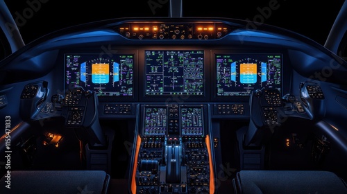cockpit, aviation, aircraft, aeroplane, flight, technology, dashboard, control, instrument, panel, screen, display, digital, modern, night, dark, illuminated, interior, transportation, travel, journey, navigation, pilot, aerospace, air, plane, jet, system, gauge, buttons, switch, lever, seat, console, electronic, interface, futuristic, design, advanced, powerful, efficient, luxury, speed, altitude, horizon, engine, wing, global