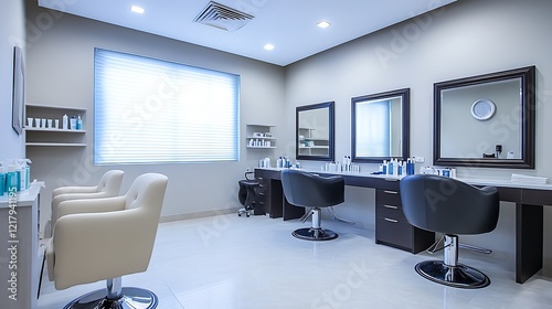 salon, hair, beauty, spa, interior, design, modern, elegant, chair, mirror, styling, product, station, workspace, professional, clean, white, grey, light, bright, room, floor, window, shelf, accessory, tool, equipment, stylish, comfortable, aesthetic, minimalist, contemporary, decor, furniture, ambience, atmosphere, luxury, sophisticated, serene, calm, relaxing