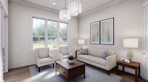 Modern and Inviting Living Room Interior with Elegant Furniture, Stylish Decor, and Abundant Natural Light, Perfect for Interior Design Inspiration and Home Staging