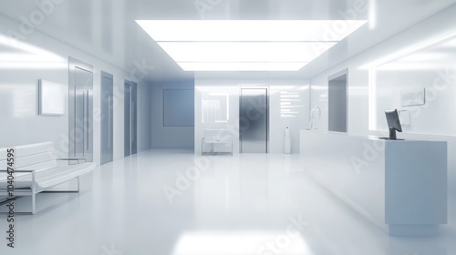 Modern and minimalistic interior of a clean hospital reception area with bright lighting and sleek design.