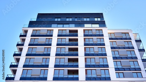 Modern apartment building in sunny day. Exterior, residential house facade.