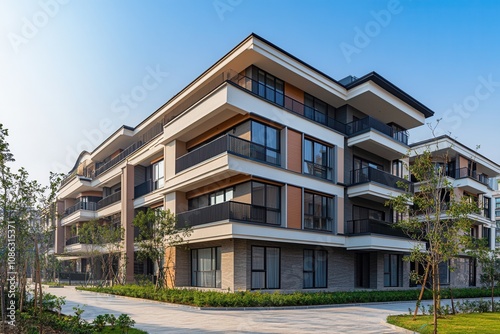 building, architecture, modern, apartment, balcony, exterior, house, residential, home, real estate, luxury, design, contemporary, structure, property, development, new, style, concrete, glasses, window, facades, urban, city, suburban, landscape, garden, lawn, grass, tree, plant, pathway, driveway, sidewalk, parking, sky, blue, day, sunny, bright