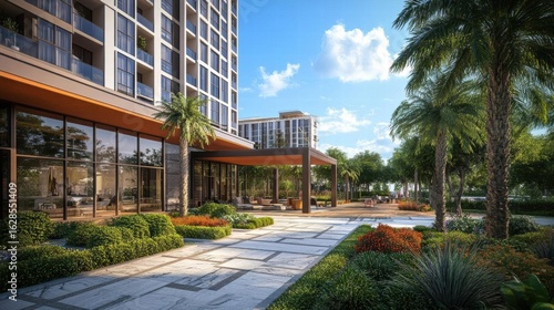 Modern Apartment Building with Lush Landscaping and Outdoor Seating Area. Resort Style Living with Palm Trees and Green Spaces.