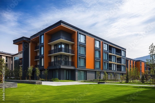 building, apartment, modern, facades, architecture, exterior, contemporary, design, residential, urban, property, real estate, home, house, development, construction, new, luxury, style, living, community, landscape, lawn, grass, sky, blue, sunny, day, green, orange, grey, window, balcony, terrace, concrete, stone, path, paseo, sidewalk
