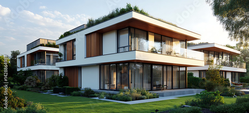 Modern apartment building with white and wood paneling exterior, green roof, large windows with wooden frames, glass balconies, small garden in front of the buildings.