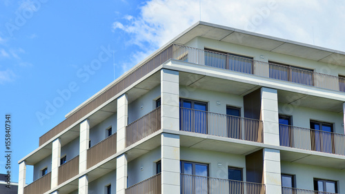 Modern apartment buildings on a sunny day with a blue sky. Facade of a modern apartment building. Modern residential apartment building complex condo.