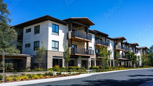 Modern apartment complex featuring multiple floors, balconies, and landscaped grounds under a clear blue sky.