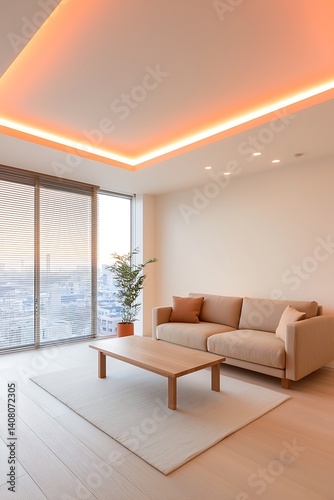 apartment, living, room, interior, design, modern, beige, sofa, hot drink, table, wood, floor, minimalist, decor, lighting, contemporary, furniture, home, cosy, city, view, window, natural, light, warm, bright, space, decorating, stylish, comfortable, plant, relaxing, simple, sunset
