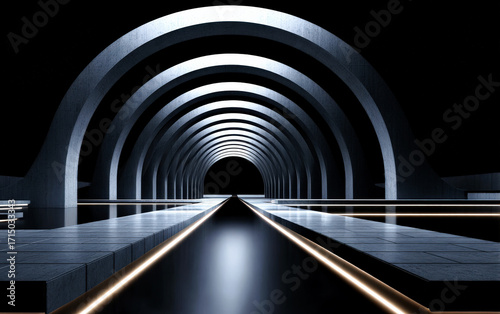 Modern Arched Tunnel with Glowing Lines in Dark Environment