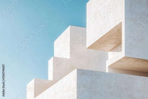 Modern architectural building with white concrete blocks creating depth, against clear blue sky. Minimalistic and contemporary urban structure