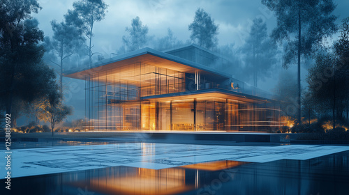 Modern architectural design blending real-life glass building with detailed blueprint, showcasing the transition from planning to completion with a dynamic contrast of cool blue tones and warm glow